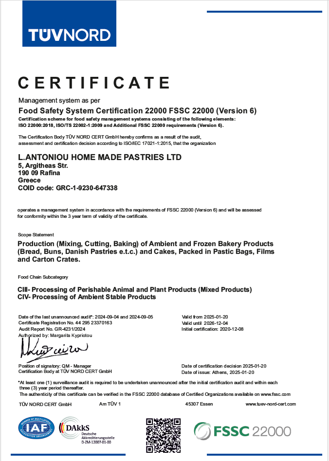 Lydia ‘s is committed to producing and marketing Dough Products and Confectionery, fully compliant with specific specifications and requirements, for the complete and continuous satisfaction of its customers, which are quality-tested before delivery. Through the harmonious cooperation of all stakeholders (management, staff, partners/subcontractors, suppliers, customers following bilateral agreements on Food Safety) it ensures the successful completion of its work. The company is committed to communicating with all stakeholders on Food Safety issues, as well as to disclosing this policy to all interested parties. Food safety, quality and consistency lead the business to long-term benefits, which are always more important than short-term ones. To meet the above, the company has installed and implemented a Food Safety Management System (FSMS), which includes all the company’s processes that affect food safety. The system is monitored, maintained and improved through inspection, evaluation and review programs. It is designed to emphasize prevention, without underestimating corrective action mechanisms when non-compliance with requirements is detected. The LIMS software (Lydia’s ISO Monitoring Software), developed specifically for the needs of the company, enables all staff to participate in quality assurance processes and in updating dozens of daily records and controls, while at the same time making the traceability of any raw material and final batch extremely fast in case of need. At the same time, the company ensures the professional competence of the Food Safety Team, the relevant personnel, as well as its external partners, who influence Food Safety performance and the overall performance of the system. The achievement of the objectives is achieved with modern know-how, compliance with legislative and regulatory requirements, compliance with market and competition conditions, with the employment of appropriately trained personnel, with auxiliary functions and with the provision of the necessary resources (i.e. moral and material means), with continuous awareness and information on Food Safety issues. The more specific objectives per function of the company are established and reviewed through Management Reviews. All of the above guarantees compliance with the requirements for Food Safety according to the ISO FSSC22000 ver.6 standard , as well as the company’s commitment to continuous improvement of the system. The validity of the certificate of each company holding the FSSC 22000 can be checked online at https://www.fssc22000.com/certified-organizations/
